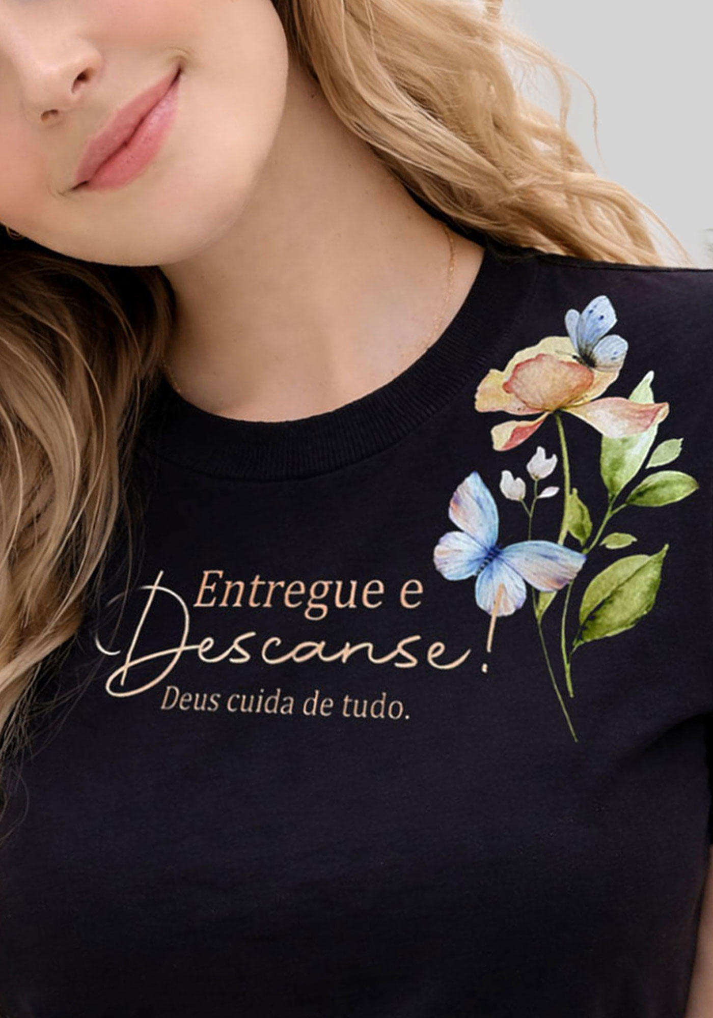 T-SHIRT FEMININA - FLOR OMBRO ENTREGUE E DESCANSE- COR PRETO