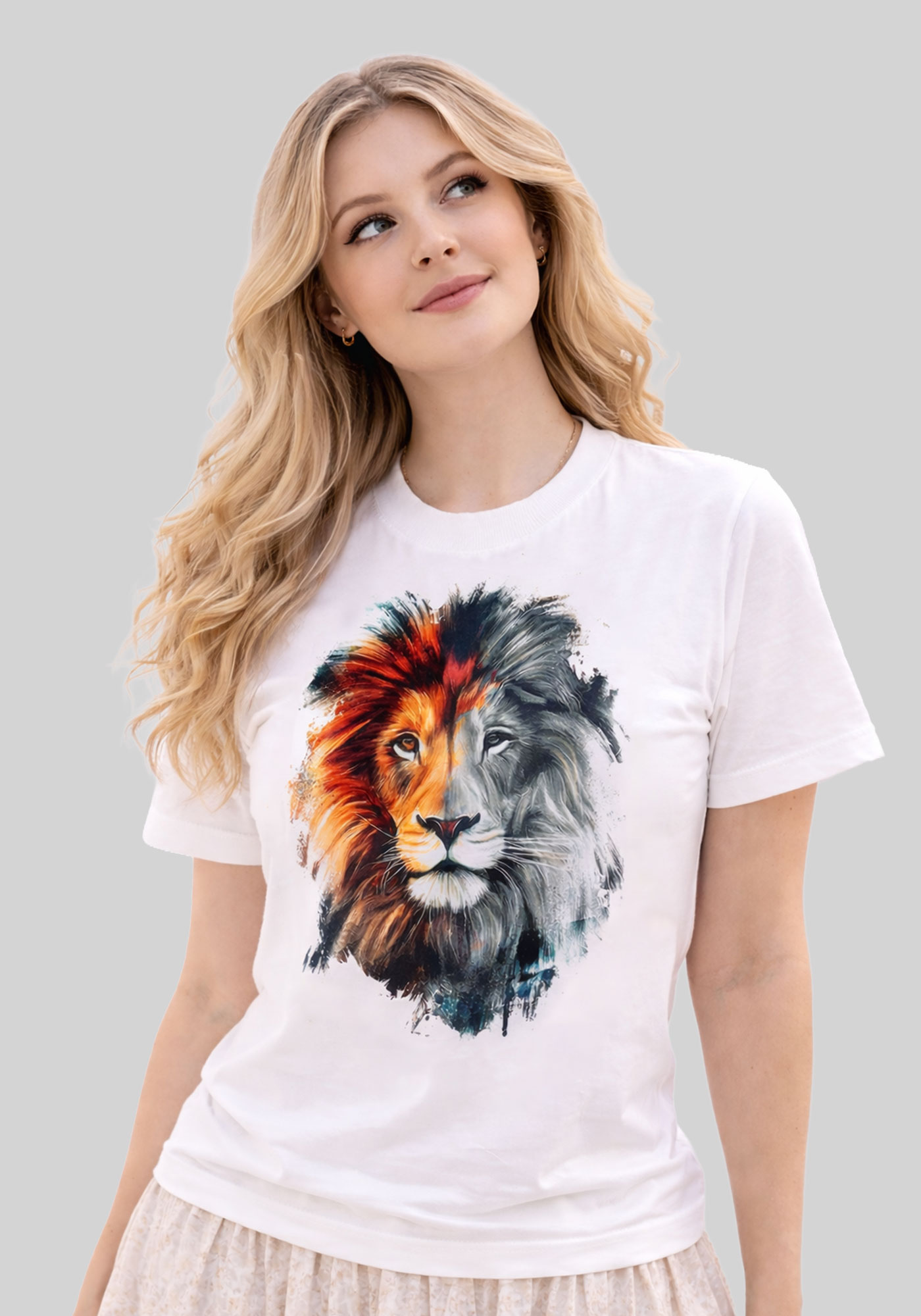 T-SHIRT FEMININA - LEÃO COLORIDO - COR MARFIM