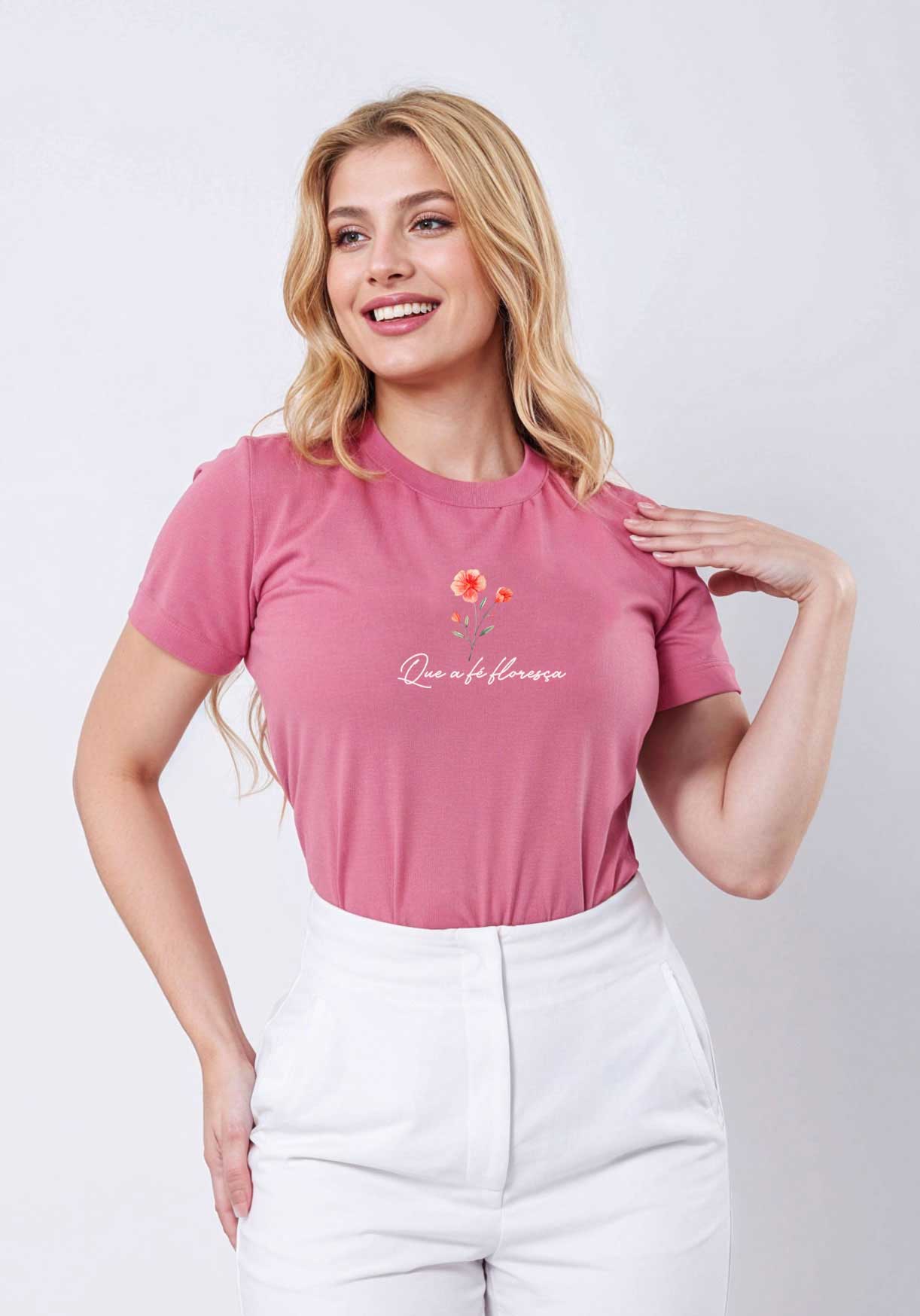 T-SHIRT FEMININA - QUE A FÉ FLORESÇA - COR ROSA BATOM